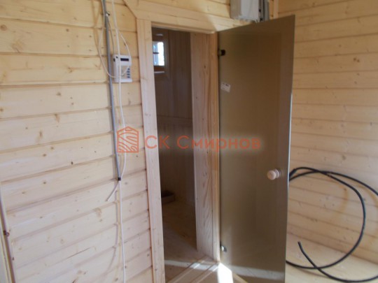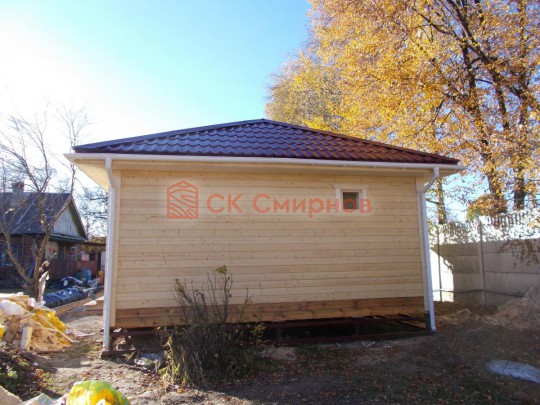 Такая одноэтажная баня 6х8 может быть построена из бруса. Ориентировочный срок строительства 10 дней.
