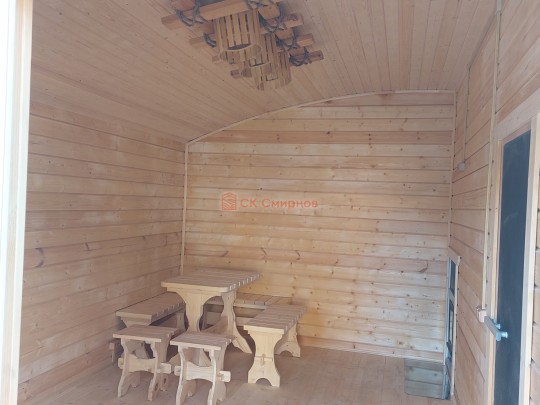В комплект бани входит стол и две скамейки из доски 19мм, как на фото. Есть комплекты из более толстой доски а также из кедра, смотрите в доп комплектации.