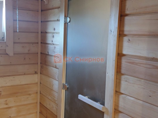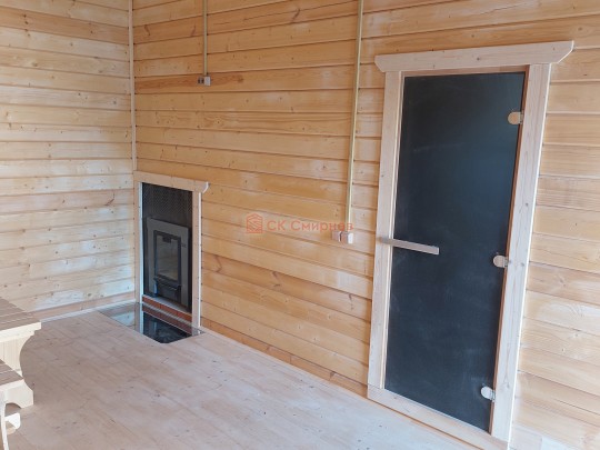 Такая одноэтажная баня 5 на 6 метров может быть построена из сухого или клееного бруса, в том числе кедрового. Баня на фото и видео как раз и построена из сухого бруса кедра — его лекго узнать по красивому красному оттенку. Снаружи покрашена Тиккурилой. Внутри есть полноценный автономный душ с бойлером.