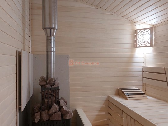 В эти бани уже входит в стоимость печь Теплодар Русь Каменка Л, обкладка ее кирпичом с трех сторон ( на пол кладется кирпич, на него базальтовый картон и лист минерита, фасад и боковая стенка выложена из кирпича ). Трубы из нержавеющей стали 1мм сэндвичи ( двойные ) , поворотная задвижка, зонт и все необходимые элементы. Есть печь с панорамным стеклом Русь каменка Панорама, она дороже немного, скоро фото и видео появится.