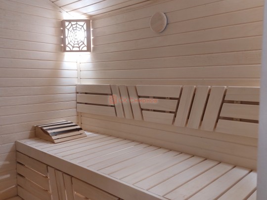 В данной бане мы используем окна вытянутой формы не открывающиеся по умолчанию, но можно за небольшую доплату сделать их открывающимися.
