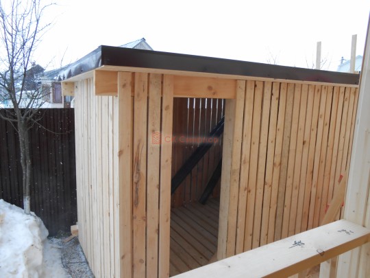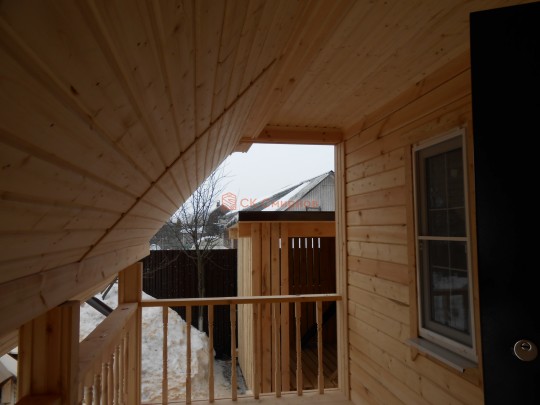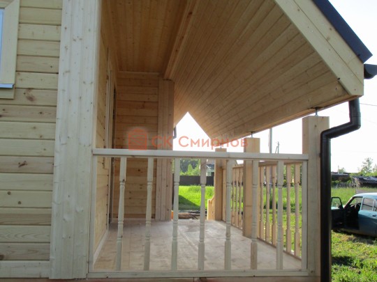 На террасе при условии что она есть делаем перила из строганной доски со всех сторон, столбы террасные также строганные, а не обрезки профилированного бруса с шипом и пазом. Домкратики на столбах для дальнейшей регулировки. Балясины будут сделаны аккуратно. Обратите внимание что в дешёвых случаях это может быть и будет просто вагонка прибирая к неотесанной доске снаружи и столбы будут не квадратные а просто профилированный брус как на видео.