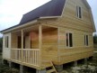 Из профилированного сухого бруса 9х14см, 14х14 см или 14х19 см. Сборка сруба в теплый угол на нагеля или гвозди 200 мм со сверлением отверстия в верхнем брусе (в зависимости от вида бруса).