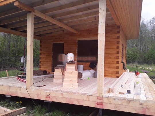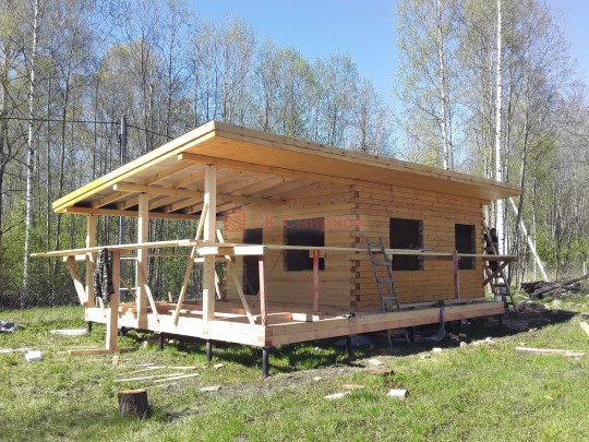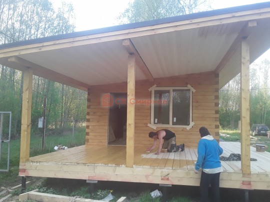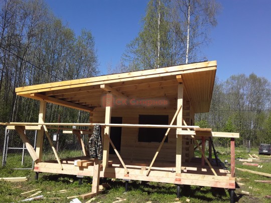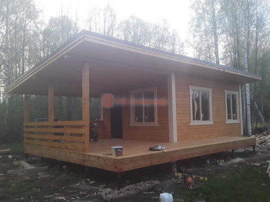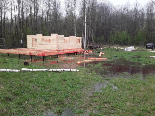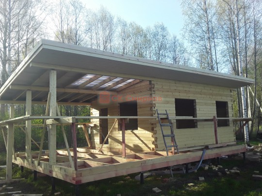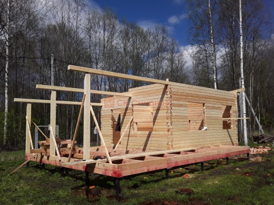 Из профилированного сухого бруса 9х14см, 14х14 см или 14х19 см. Сборка сруба в теплый угол на нагеля или гвозди 200 мм со сверлением отверстия в верхнем брусе (в зависимости от вида бруса).