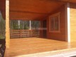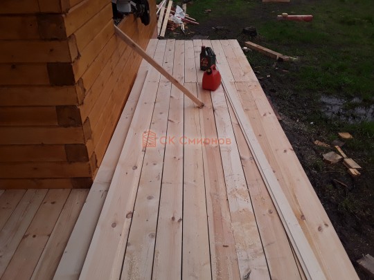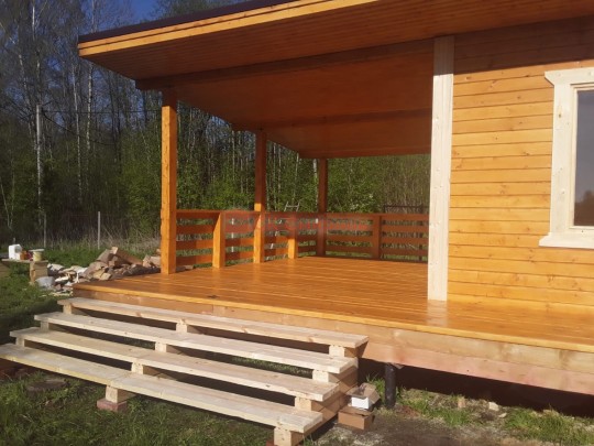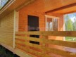 На террасе при условии что она есть делаем перила из строганной доски со всех сторон, столбы террасные также строганные, а не обрезки профилированного бруса с шипом и пазом. Домкратики на столбах для дальнейшей регулировки. Балясины будут сделаны аккуратно. Обратите внимание что в дешёвых случаях это может быть и будет просто вагонка прибирая к неотесанной доске снаружи и столбы будут не квадратные а просто профилированный брус как на видео.