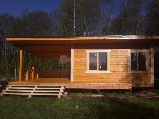 Из профилированного клееного бруса 9х14см, 14х14 см или 14х19 см. Сборка сруба в теплый угол на нагеля или гвозди 200 мм со сверлением отверстия в верхнем брусе (в зависимости от вида бруса).