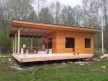 На фото представлен проект небольшого дачного дома №277 габаритами 6х10 метров и отличной планировкой общей площадью 60 квадратных метров. Это одноэтажный дом с современной плоской односкатной крышей. Почти половина площади отведена под роскошную большую террасу. Внутри всего 3 помещения: кухня-гостиная, крохотная спальня и санузел.